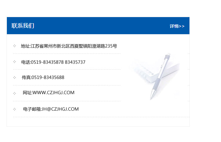 傳真:0519-83435688    郵編:213135    網址:WWW.czjhgj_com.ngwlw.com    電子郵箱:JH@czjhgj_com.ngwlw.com